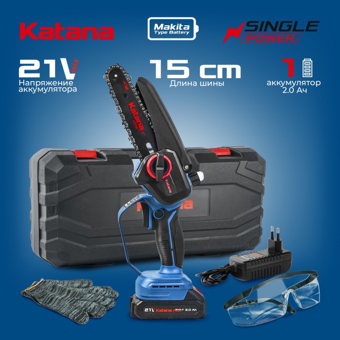 ПИЛА ЦЕПНАЯ АККУМУЛЯТОРНАЯ KATANA AP4207(21В,1X2АЧ,ШИНА15СМ,ЗАЩ.КОЖ.,СМАЗКА ЦЕПИ,БЕСКЛЮЧ.,КЕЙС)