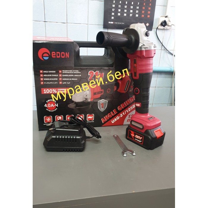 Данная УШМ входит в линейку инструмента на универсальных аккумуляторах Edon OAF21. Инструмент может комплектоваться аккумуляторами различной емкости: 1.3 Ач, 2,0 Ач, 3,0 Ач. и 4,0 Ач. Преимущественной особенностью данной линейки является возможность использовать один аккумулятор со всеми инструментами серии OAF21 – триммер, воздуходувка, кусторез, отрезная пила, реноватор, шуруповерт, фонарь и т.д.