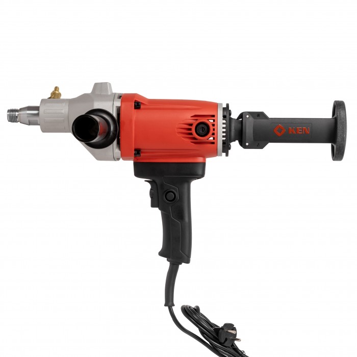 KEN 6110B - универсальная модель для выполнения монтажных и отделочных работ. Высокие показатели мощности и плавной скорости вращения шпинделя до 2000 об/мин гарантируют быстрое и качественное сверление отверстий диаметром до 110 мм. Использовать оборудование можно как в ручном режиме, так и прикрепив его к станине. Дрель оснащена системой подачи воды для удаления пыли и охлаждения коронки. Для удобства сверления в труднодоступных местах предусмотрено два положения для крепления рукоятки устройства.