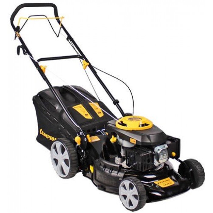 Газонокосилка Champion LM4627 умеет собирать, выбрасывать в сторону и мульчировать скошенную траву. Оснащена приводом колёс для легкого ведения.
